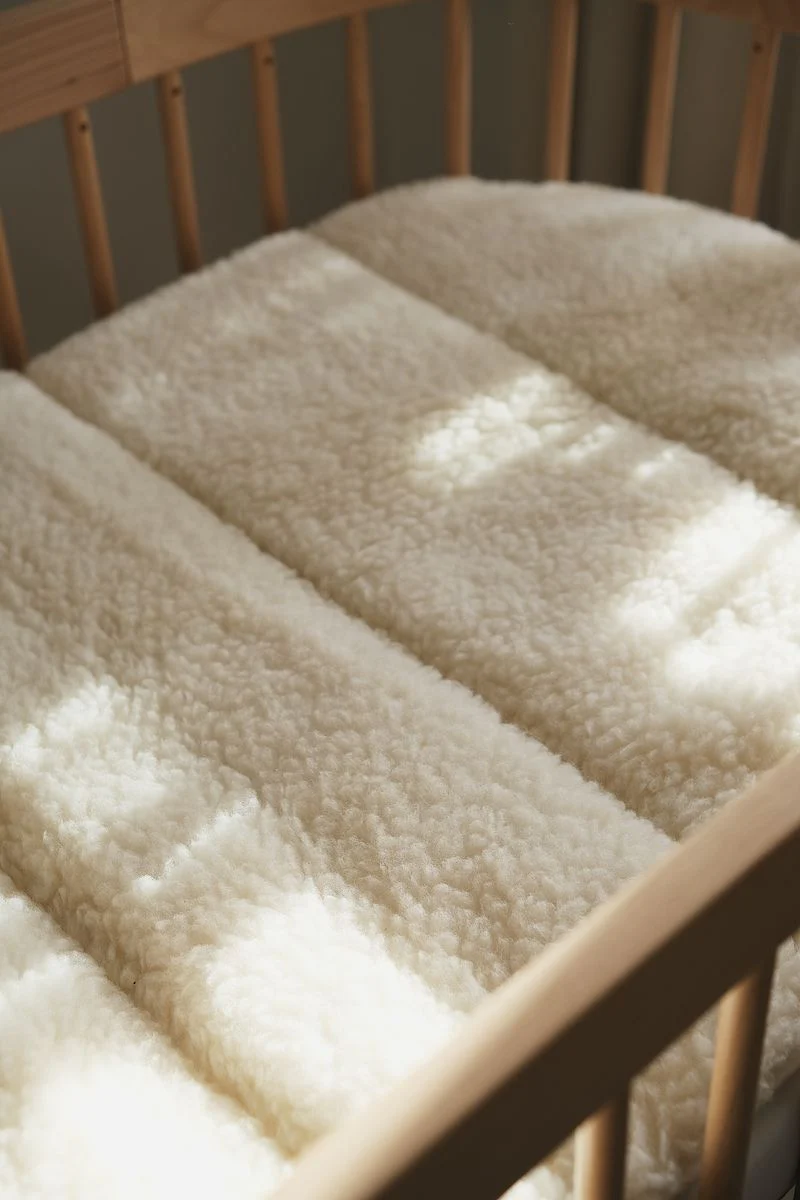 Rullemadrassen er fremstillet af 100 % mulesing-fri merinould kombineret med blød perkalbomuld. Merinould er kendt for sin ekstra fine fiber, som føles blød mod huden og er særligt velegnet til sensitiv babyhud. Uden syntetiske materialer får dit barn en naturlig og åndbar liggeflade, der bidrager til ro og velvære.