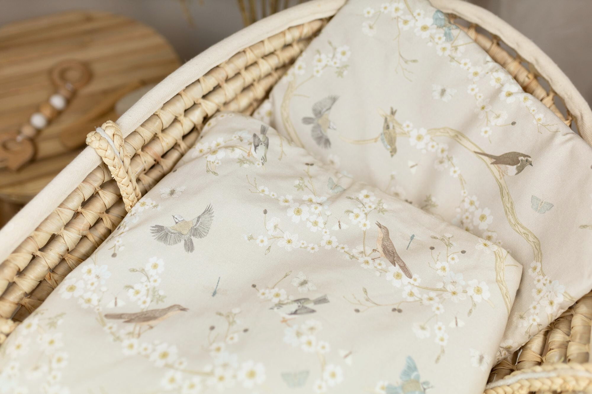 Babydynen og puden er syet som et samlet sæt uden løse betræk, knapper eller lynlåse – så der er ingen risiko for, at små dele løsner sig. Den faste sammensyning gør det nemt for forældre at holde rent, da sættet blot kan maskinvaskes i ét stykke.