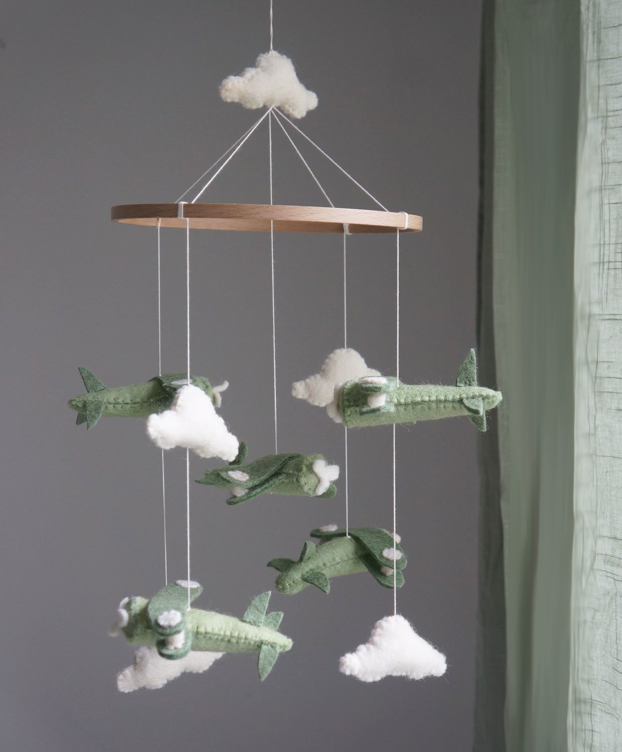 Denne babyuro i filt er et godt valg, hvis du gerne vil gøre babyværelset mere personligt uden at fylde det med unødig uro. Flyvemaskinerne giver karakter, skyerne holder udtrykket blødt, og helheden føles rolig på den måde, som faktisk fungerer i hverdagen. Se den her, hvis du vil have en uro i filt, der både pynter og gør rummet mere rart at være i.