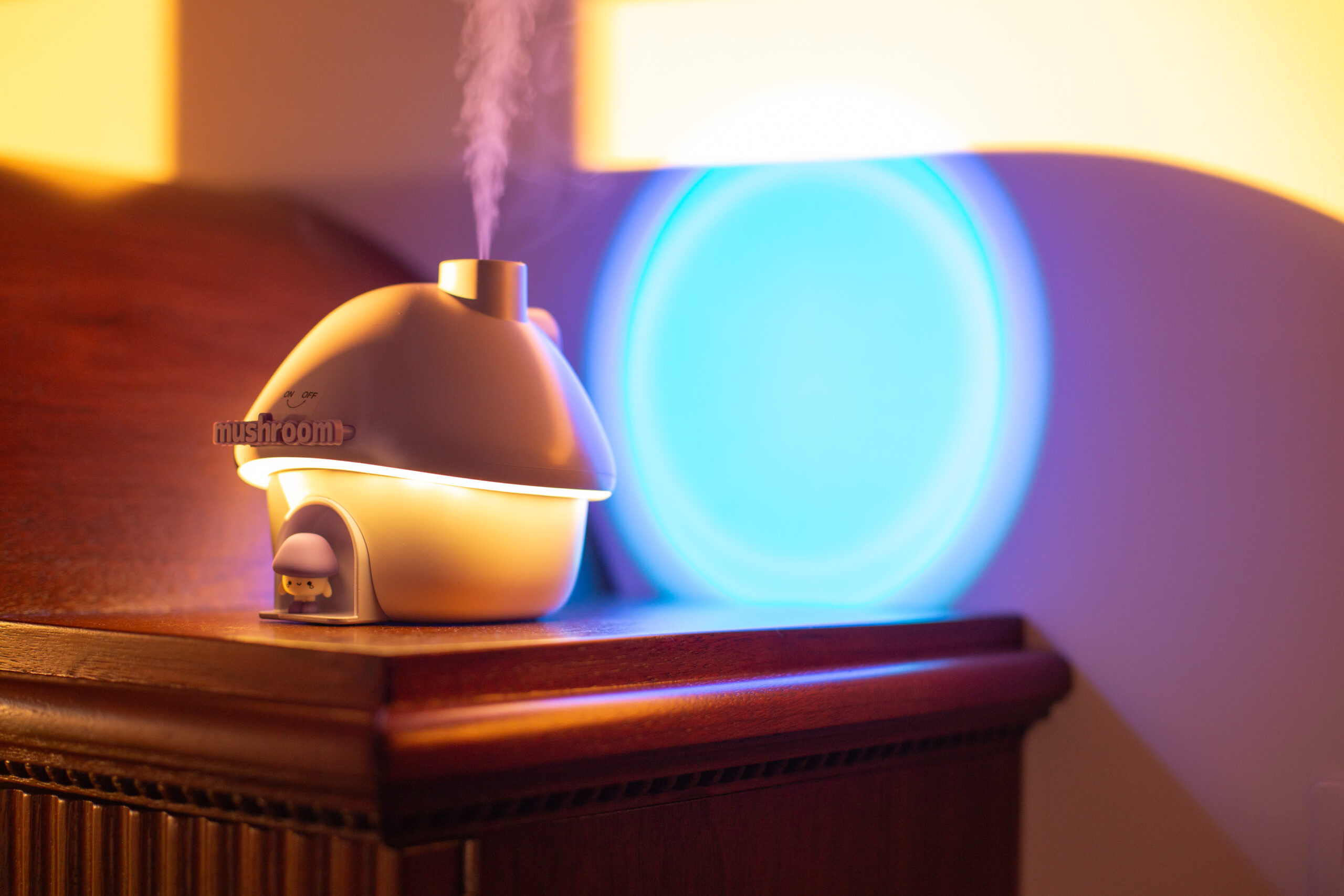 Luftfugter til børneværelse med blidt lys og rolig fugtmist